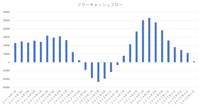 その後、人件費の削減やコストの見直しなどのスリム化を図った事で改善していき、再びフリーキャッシュフローは順調に増えていたのですが、近年は急増するAI需要に対応する為にデータセンターを急ピッチで拡大しており、そのための設備投資に莫大な資金が必要となることから営業キャッシュフローの増加よりも投資キャッシュフローの増加のペースの方が早く、フリーキャッシュフローはドンドンと減っています。