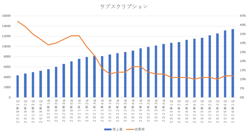 アマゾンプライム会員の手数料(プライム使用料等)などのサブスクリプション収入の伸び率については 12%増加となっていて引き続き安定した成長が続いています。アマゾンプライムミュージックやアマゾンプライムビデオなどのコンスタントな課金とプライム会費の徴収でコンスタントに二桁成長をしている優良事業ですが、大きく成長していくような事業ではなく、加入者数が頭打ちになればジリ貧になっていくような事業なので、成長性が鈍化してもおかしくなく、いずれは現状維持でも充分だと判断される事業なのだと思います。
