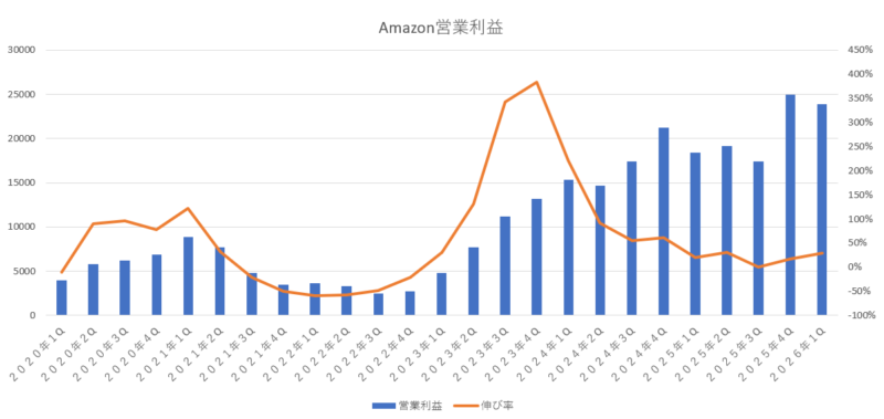 AWS部門は、アマゾンにとって一番大切な部門であり、今後の成長性に期待されている部門なのですが、今期の成長性もしっかりしており、売上・営業利益ともに 20%以上の成長性を叩き出していました。AWSについては、成長性が 10%台前半に落ち込んでいた時期もあったのですが、AI需要の増加と共にクラウドの需要も拡大しており、成長性も更に高まっていますね。