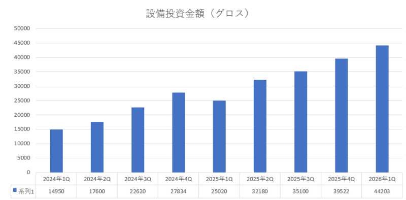 ただ、懸念材料はやはり設備投資の負担の重さだと思います。今年度は2000億ドルを設備投資に費やすとなっていますが、すでにフリーキャッシュフローは 12億ドルにまで激減しており、来期にはフリーキャッシュフローがマイナスに突入する可能性は非常に高いです。重すぎる設備投資の負担に見合うリターン(収益)が近々上がってくるのであれば問題ないのですが、その辺りが未知数な所が投資家の不安を高めているのだと思います。