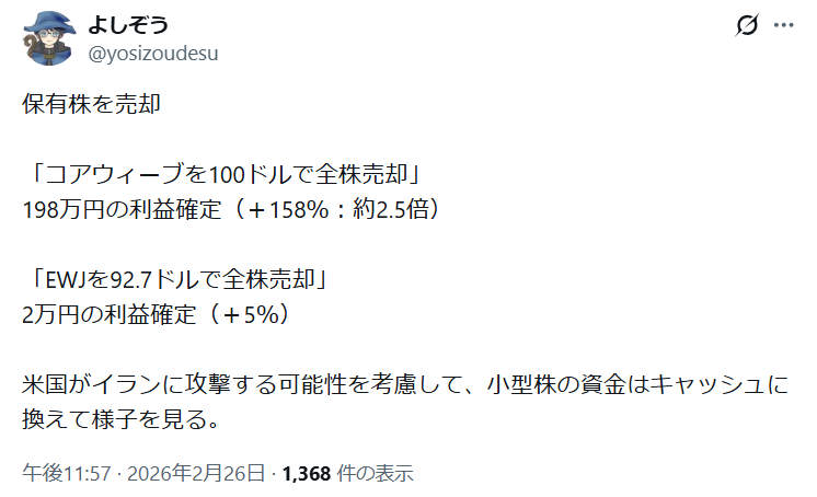 X(旧ツイッター)では呟いていましたが、2月26日の夜に保有株を少し売却してキャッシュを増やしておきました。米国はイラン周辺に空母打撃群を投入して核開発への圧力を強めています。現在、2隻の空母がイラン周辺に配備されていて、いつでもイランへの攻撃が可能となっていました。核開発交渉が決裂すれば攻撃の可能性が高まっていたのですが、来週にはまだ交渉が控えている段階にも関わらず、米国とイスラエルはイランへの攻撃を実行しました。