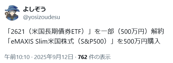 さて、6月末~9月末の間では、「2621(米国長期国債ETF)」の一部(約500万円)を解約して、その資金で投資信託の「eMAXIS Slim米国株式(S&P500)」を約500万円購入しました。9月の雇用統計や物価指数などを考慮するとFOMCにおいて利下げが決定的な状況だったので、「2621(米国長期国債ETF)」を売却して投資信託「eMAXIS Slim米国株式(S&P500)」に入れ替えておきました。