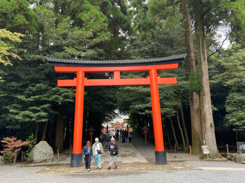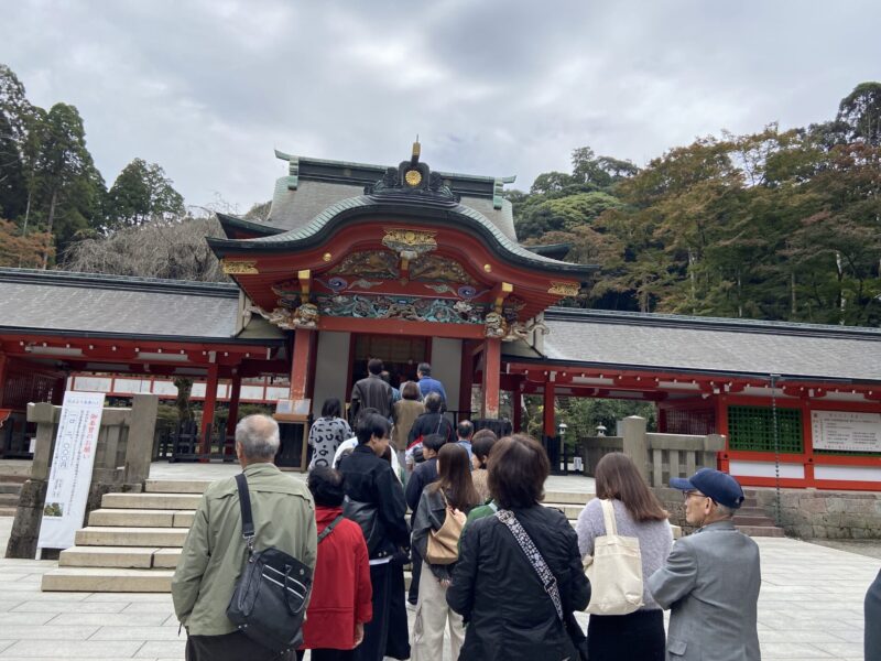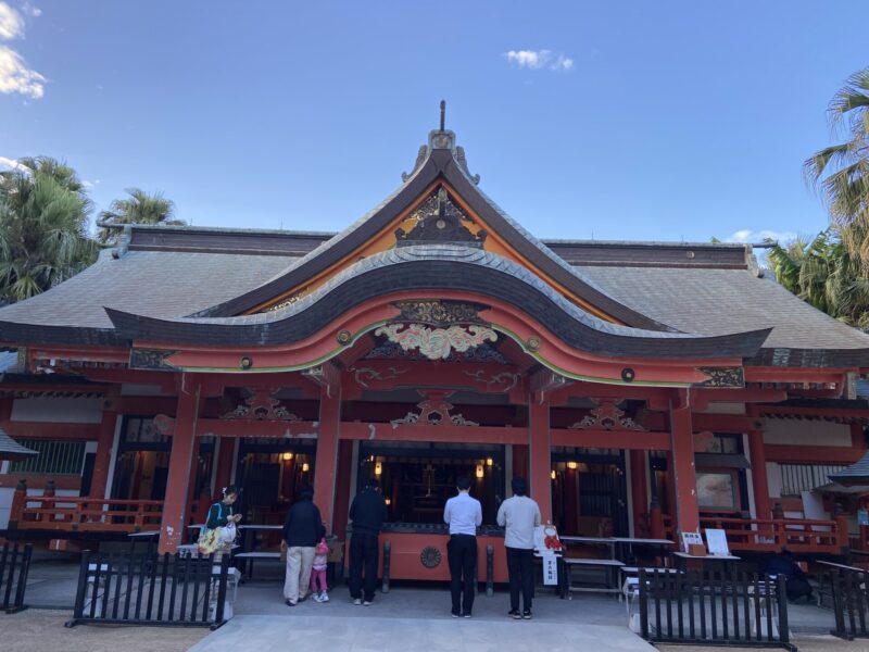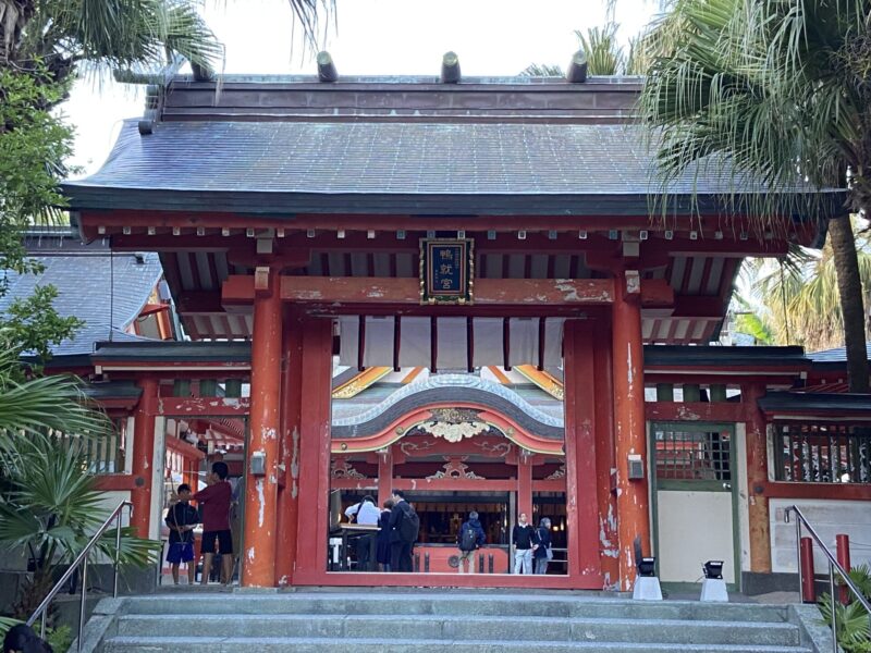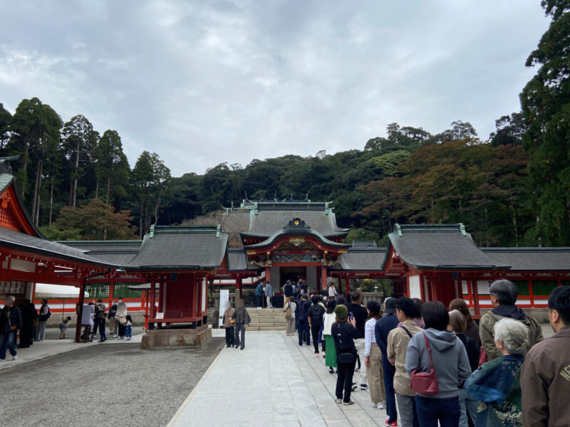 関西空港から鹿児島空港までは約1時間ほどで到着したんだ。空港についたらレンタカーを借りて、まずは霧島神宮へ。平日の午前中に行ったのに、霧島神宮は結構な参拝客がいて、お参りをする拝殿には何人も並んでいたんだよ。