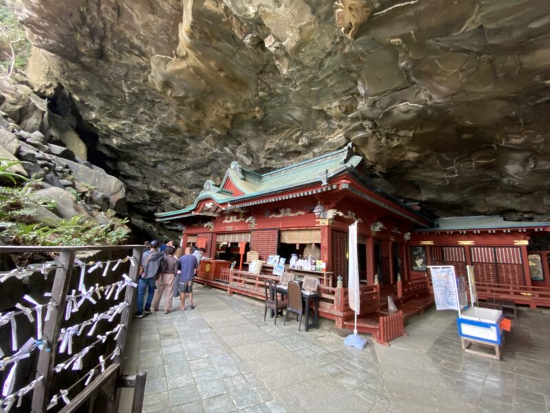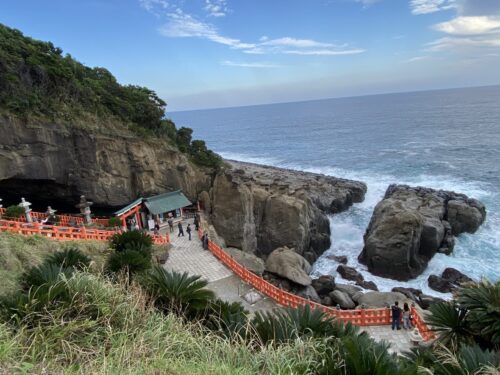 海沿いに建っている神社で、海からの荒波の音が聞こえる神秘的な場所にあるよ。鵜戸神宮には駐車場が2つあるのだけど、神社から一番近い場所にある駐車場は道が狭いから、手前にある駐車場(鵜戸神宮観光駐車場)に停めて、少し歩いて(徒歩10分ほど)行く方が安全かなと思うよ。