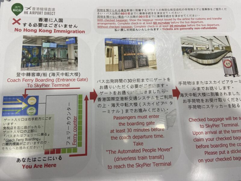 バスのチケットと澳門行きのシール(服に貼る分と荷物に貼る分)をもらって、第一の関門突破した事で意気揚々とダイレクトバスの乗り場へと向かっていくんだ。でも、その時は知らなかったんだ。乗り場では英語力ゼロの俺にとって荷が重いトラブルが待っていた事を。
