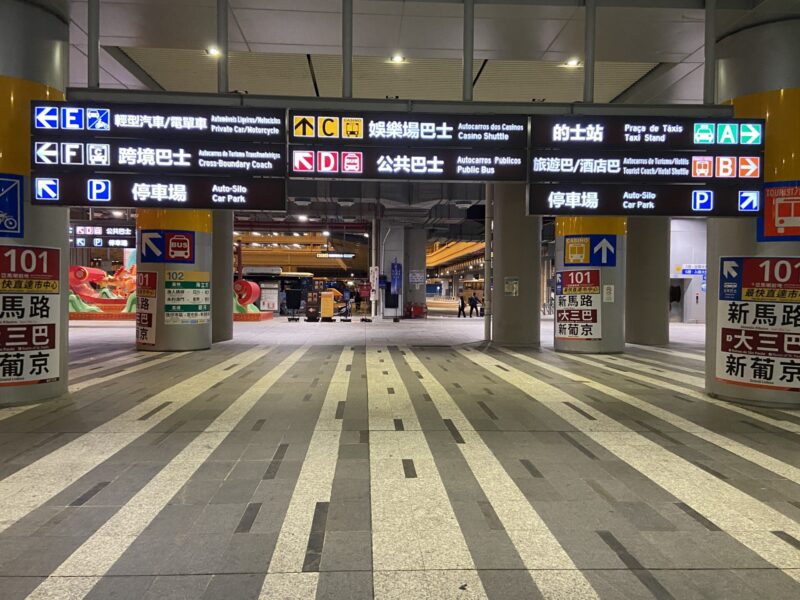 20:00出発のバスだったけど、荷物が遅れたためなのかバスが出発したのは 20:15頃だった。港珠澳大橋澳門口岸(マカオの国境ターミナル)に着いたのは 45分後の 21:00。マカオ到着後は、流れに沿って歩いて行くと入国審査があり、パスポート見せるだけで特に質問などもなくスルー。無事にマカオ到着だぜ。