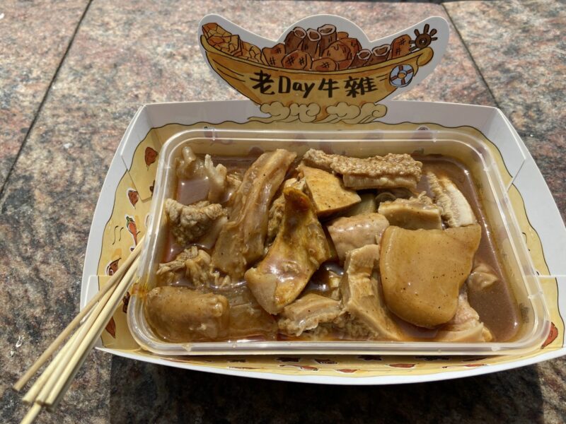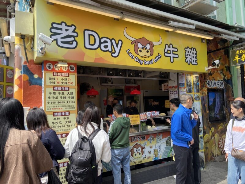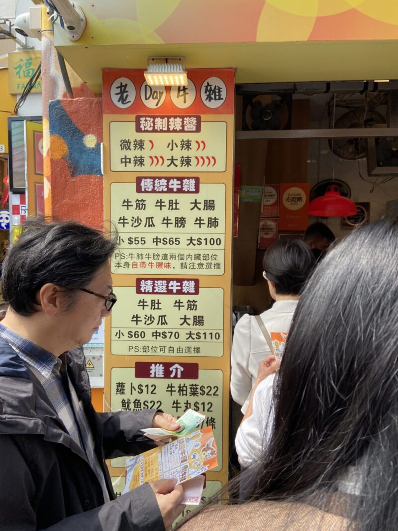 さて、エッグタルトを堪能した後は少し小腹が空いたので、ホルモンを食べに行く事に。官也街には「老Day牛雜」という有名なホルモン屋さんがある。ここはいつも行列になっているみたい。ちなみに、エッグタルトの有名店の1つで旧市街地にあるマーガレット・カフェ・エ・ナタの向かいにも、「老Day牛雜」の支店があり、ここは空いていたので、旧市街地にいるなら、そこで食べた方がいいかもね。
