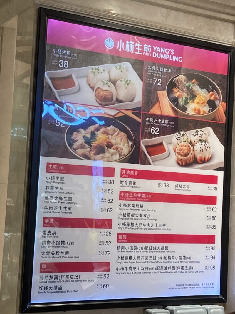 もう夕方になってきたので、ホテルにもどって晩御飯を食べる事にした。今日の晩御飯はギャラクシーマカオにある「小楊生煎(Yang’s Dumpling)」というお店で食べる事に。焼き餃子(焼き小籠包)がメインのお店みたい。色々な種類を食べてみたかったので、焼き小籠包3種類と雲吞麵のセット(94パカタ:1,840円)を頼むことに。