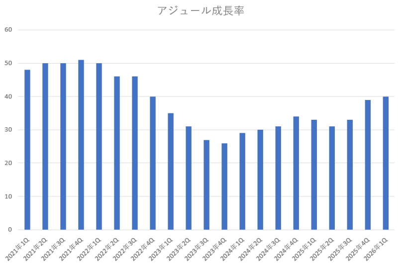 これらの3つの部門の中でも、マイクロソフトの成長性を引っ張っていて、今後も期待されているのが「Intelligent Cloud部門」なんだけど、その中でも最も期待されているのがアジュールだよね。そのアジュールは規模が大きくなるにつれて年々成長率が落ちてきていたけど、最近はAI需要などもあって再び伸びてきていて、今期のアジュールの成長率は 40%増加と久しぶりに40%台に乗せて大きく加速していたね。