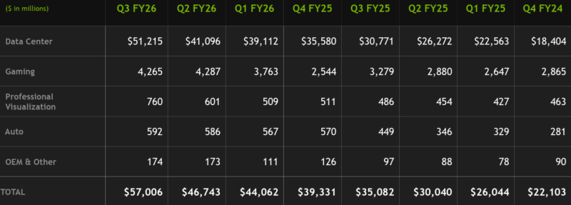 各部門別の業績も、どれも順調すぎるぐらい順調な結果となっていますね。特にデータセンター部門は市場予想が493億ドルだったので市場の想定を上回る結果(512億ドル)を叩き出していますね。時代の流れに乗って、GPUが売れに売れ続けている感じですね。